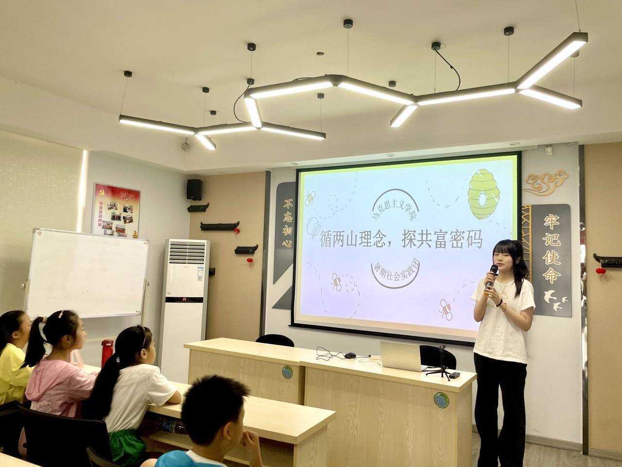 实践团成员以童话故事形式为参与活动的孩子们带来了一堂主题宣讲。宣讲巧妙运用互动问答、角色代入等新颖形式,将较为学术的理念生动化,让小朋友们置身于故事情景之中,让孩子们进一步去思考余村从“石头经济”发展到“生态经济”的原因,从而使孩子们对于“两山”理念有一个更为深刻的了解。