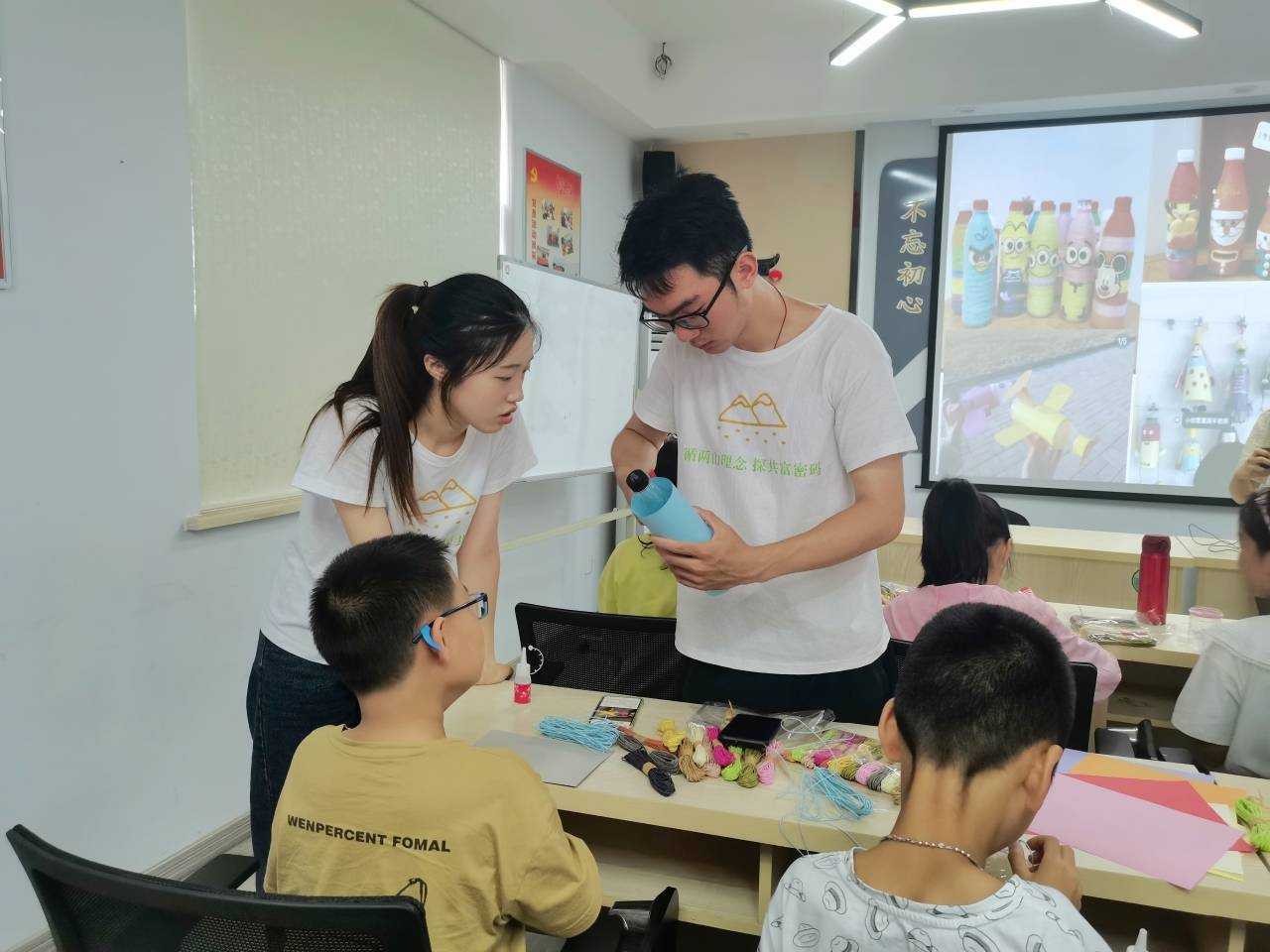 在宣讲结束后,实践团成员组织开展了“塑料瓶变废为宝”环保活动,每一个小朋友带着自己瑰丽的想象,通过剪刀、卡纸、毛线等一系列的材料将头脑中的构思付诸于实践,变出了一件件独具风格、新奇独特的工艺品。小小的塑料瓶,有着大大的教育价值。活动既发展了孩子们的动手能力,又让孩子们树立低碳环保意识,感受环保生活带来的乐趣。